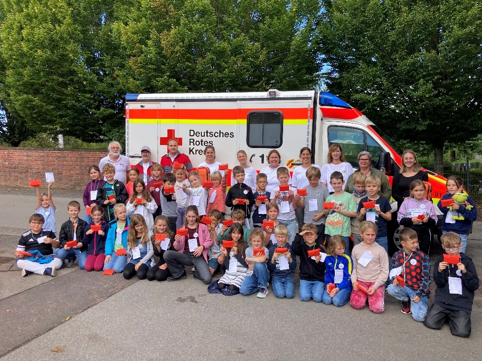 Ein ganz besonderes Highlight erwartete die jungen Nachwuchsretter zum Abschluss: der Besuch eines echten Krankenwagens. Neugierig durften sie einen Blick ins Innere werfen, auf der Trage Platz nehmen und Fragen an die Rettungssanitäter stellen. Für viele war dies der spannendste Moment des Tages.